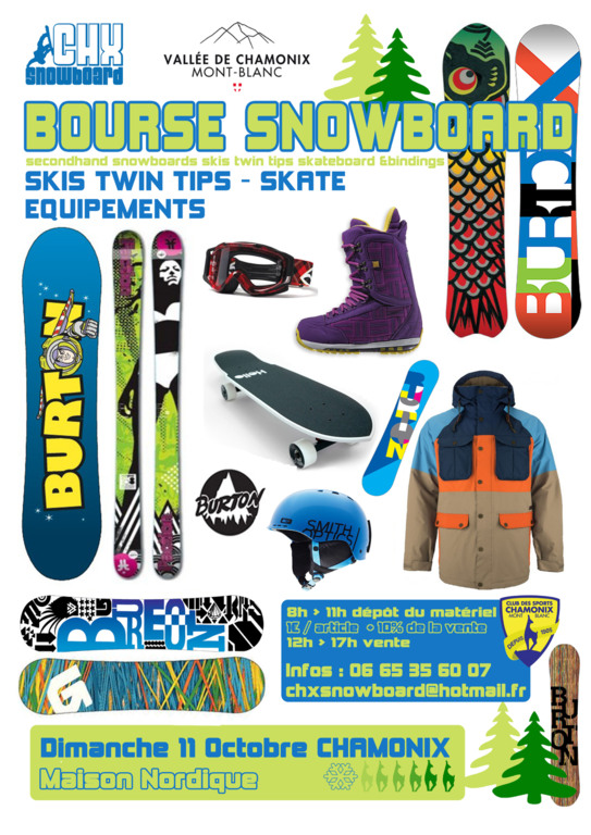 Cette année, rendez-vous le dimanche 11 octobre à la maison nordique de Chamonix pour réaliser les affaires de l'année à l'occasion de la bourse au snowboard édition 2015 !!! Tous les détails sont sur l'affiche, ne ratez pas ce rendez-vous, vendeurs ou acheteurs, c'est LE JOUR pour s'équiper ou vider un peu ses placards ! Les coachs du chxsnowboard seront présent pour vous conseiller !